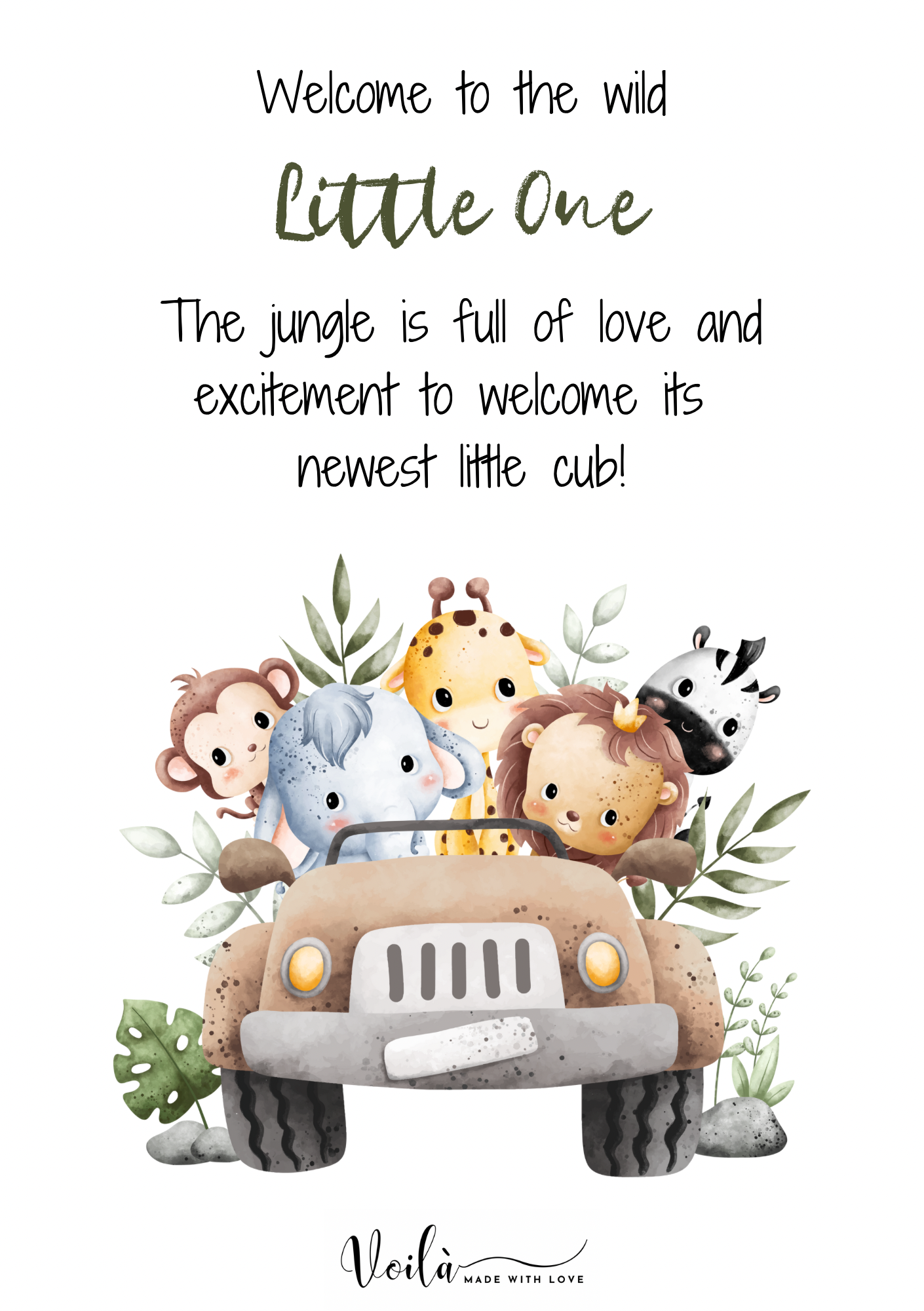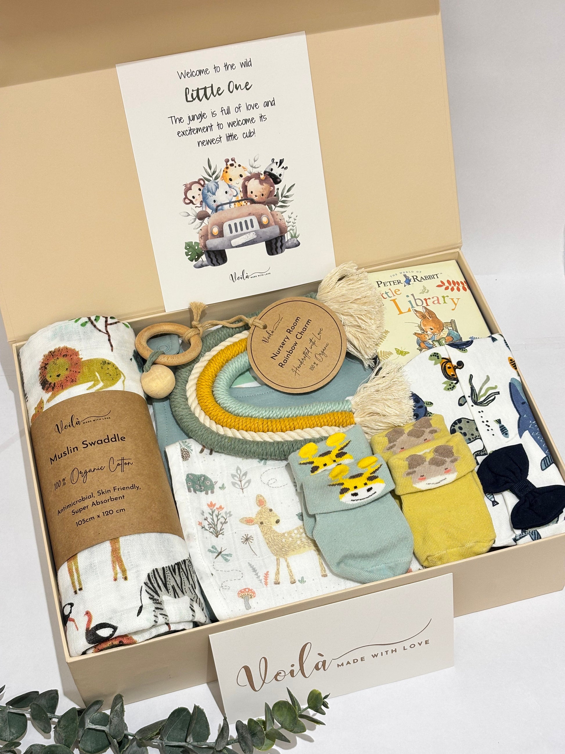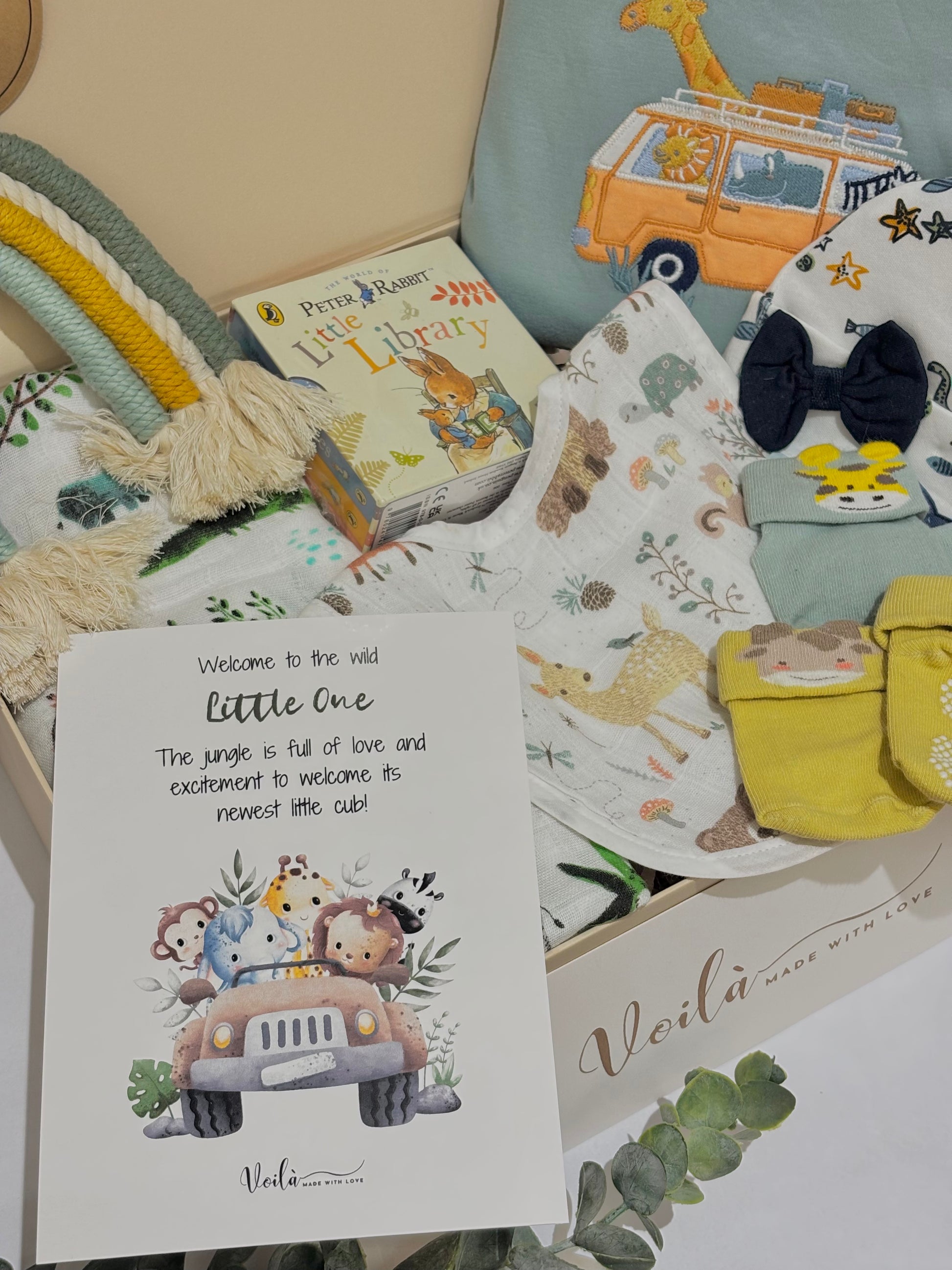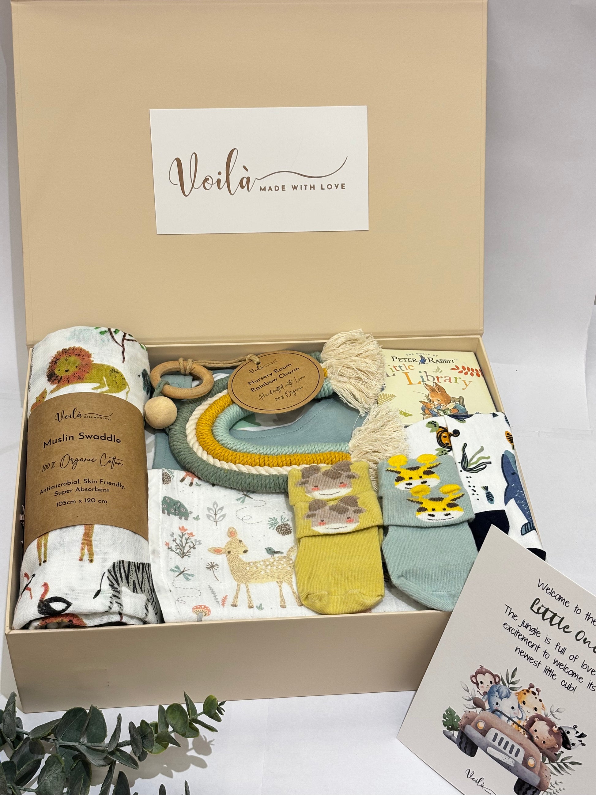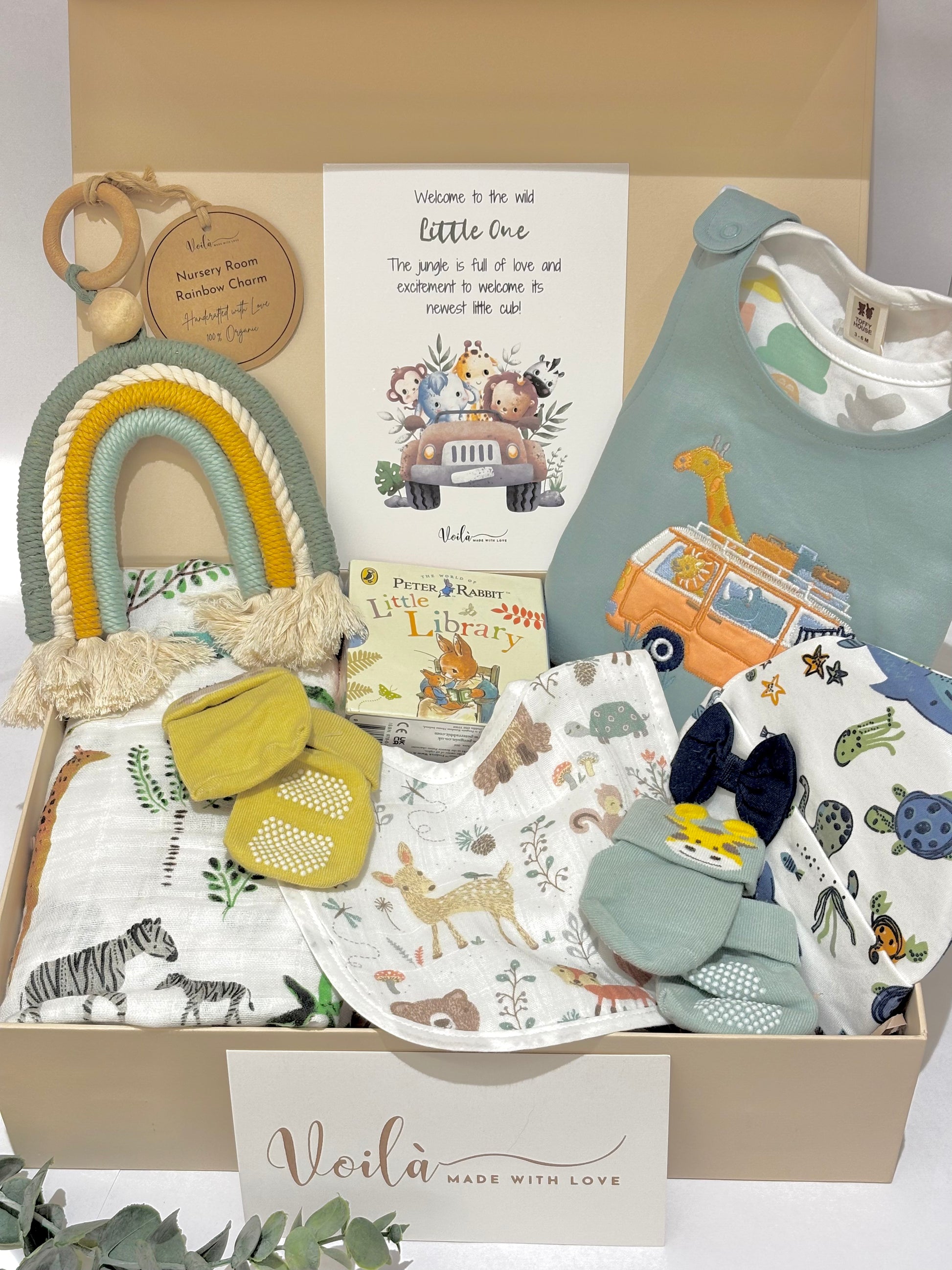 A delightful jungle-themed hamper filled with playful baby essentials and keepsakes, perfect for welcoming a little explorer.