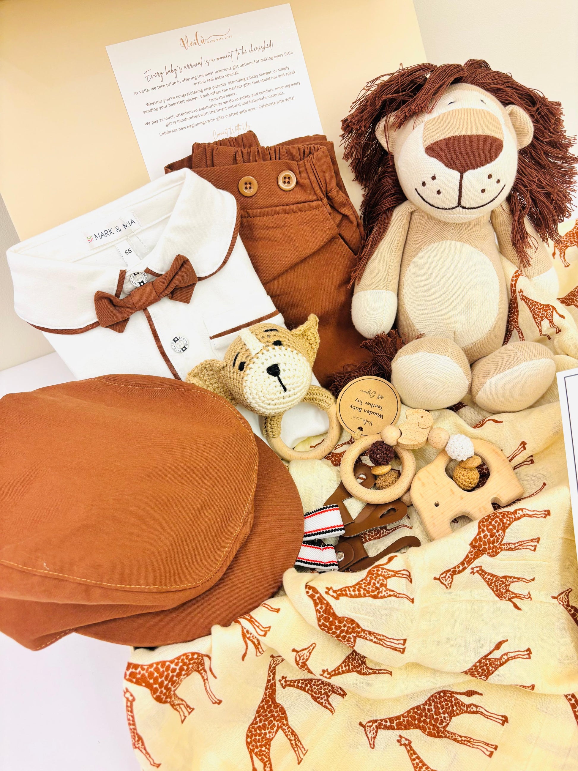 Beautifully presented, this hamper makes an unforgettable gift for baby showers, newborn celebrations, and little kings of the jungle.