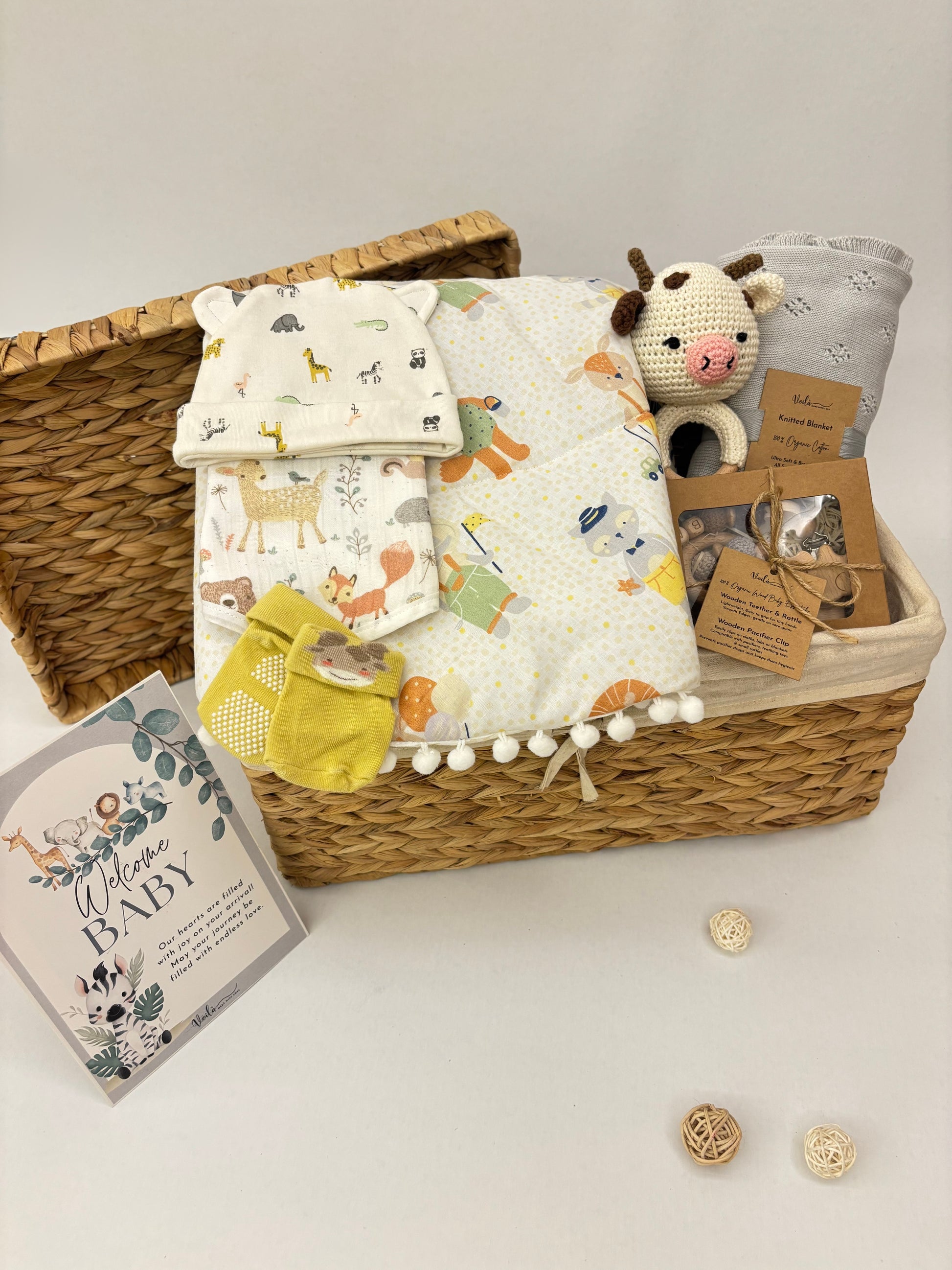 Step into a world of adventure and charm with our Royal Safari Treasure Chest. Inspired by the wild yet wrapped in elegance, this hamper is thoughtfully curated to celebrate the little one’s grand arrival. Filled with cozy essentials and handcrafted treasures, it’s the perfect blend of utility and luxury—making it a gift as timeless as the safari itself.